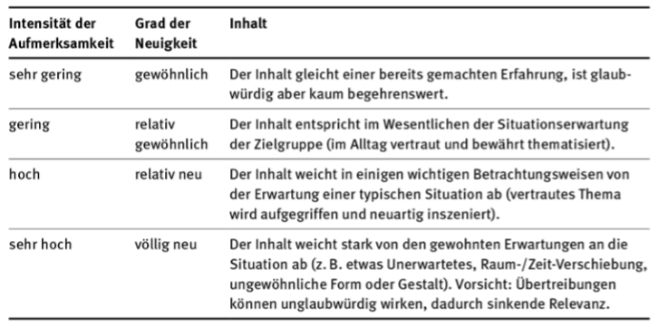 Tabelle: Beispiel, wie der Grad einer Neuigkeit die Intensität der Aufmerksamkeit beeinflussen kann (Quelle: Förster/Rost/Thiermeyer 2009, 66)